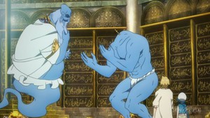 As you can tell by the names, Ohtaka directly pulled from her source material, and this continues with other characters: we meet Jafar, Scheherazade, Cassim, Miriam, Judar, and many others. Of course, unless you've read The Arabian Nights, these names might not mean anything to you. Most of them come from three of the best known stories in the source material, although ironically those are also the three that most scholars agree were probably added to the book later to pad things out, since full copies of the 13th century text are basically impossible to find.