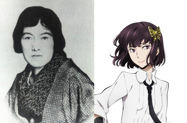 I'll start with Akiko Yosano, partly because she's one of my personal favorites in terms of her works, but also because of how her anime counterpart plays with her real-life poetry. Born in 1878, she's one of the longer-lived authors in the show, passing away of a stroke at age 63 in 1942. Yosano was a writer of tanka poems, an ancient style of poetry typically translated into five lines in English, although no line breaks were typically present in the original Japanese, at least not in terms of how most European languages write poetry. She began publishing early, in high school, and her first collection of poetry came out in 1901. Midarigami, which is usually translated as Tangled Hair, although Disheveled Hair is a little closer to the true meaning, remains her most widely known work, although she also produced several other volumes and a new translation of The Tale of Genji. Yosano's work was far more sensual and sexual than most women poets at the time – she's largely credited with being the first female poet to use the word “breasts” in a sexual context – and it made a large impression on the writing world, particularly women. The title itself has a very sensual connotation – rather than meaning “tangled” as in “unbrushed and snarled,” midarigami is meant to evoke the image of a few stray hairs brushing the nape of a woman's neck as they escape from her neat up-do; her sexuality unable to be bound by propriety. This, along with her career of helping women writers to get their start in publishing and her passion for equal rights, is probably the biggest contributing factor to how Yosano is portrayed in the show. While she is clean-cut in appearance, with a slightly messy bob and a skirt that goes to her knees, she is also the show's version of the “sexy nurse” trope – her gift is “Thou Shalt Not Die,” a healing ability. The wispy quality of her hair is clearly a reference to Midarigami, and the use of the aforementioned trope is likely due to the sensual nature of her poetry. It isn't a perfect match, but it does evoke a modern version of the sexuality she has come to represent.