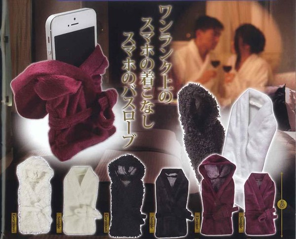 Sometimes an inexpensive joke is worth it on Christmas morning. Clothes for smartphones, usually in gachapon machines, aren't too unusual. We've featured underwear for both smartphones and water bottles on the website. These are a little more demure. Plush bathrobes to dress up your phone after a hot bath. Still, don't take the phone in the bath, that rice trick doesn't always work.