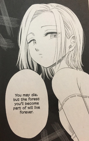 The story of Ban and Elaine feels like myth in the way it marries things of great scope and import to small moments of grounded emotion. The conflict between the humans and the fairies is classic in how it boils down a cosmic debate over the soul of our species (i.e., does human atrocity make all of our species evil) to hurt inflicted by single individuals, with how humans harmed Elaine's friends. Though Ban and Elaine's connection is a deeply personal one, it is also Elaine's every dark thought about humanity, honed and hardened through literal centuries, being upended. The scale of that shift is dug into so beautifully, both in Elaine's characterization and the way the forest, usually hostile to humans, reacts to Ban's earnestness.