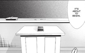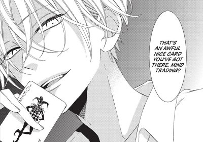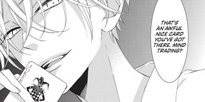 The problems arise from the first three-quarters of the volume, which follows Azusa and Karino. The base plot of the volume is that at this particularly horribly staffed high school, faculty has somehow never noticed that the students “play” a “game” where they have to find cards from a deck hidden around campus and have their social status determined by them, which, shockingly enough, leads to massive concentrated bullying. These games happen randomly throughout the year, so Azusa's fall from glory as the King to the Target (joker) isn't too surprising. What's distasteful about the whole thing is that one of his cronies from the previous round decides to use his new status as King to conduct an anti-Azusa campaign, threatening the other boy with gangrape and frequently raping him himself. Azusa's backstory makes all of this that much worse, with his mother being a sex worker who routinely gets beaten up by her clients and clearly wants better for her son. The implication is that Azusa was using his high social status at school to avoid her fate, only to be plunged into it in some sort of weird BL incarnation of Naturalism.
