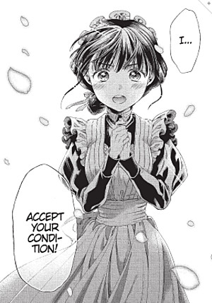 It's an especially nice touch that this reference is in the volume because it's fairly exclusively told from Hanako's point of view, so we don't get much, if any, of Lady Alice's firsthand thoughts. Hanako doesn't understand why anyone should care about who someone loves or is attracted to, and this could get her in trouble later on – in fact, it very nearly does with Lady Alice's fiancé, who warns Hanako off as a potential rival for Alice's affections. Lady Alice is made to feel “unnatural” by everyone for just being herself, and the fact that Hanako finds this baffling and not a little mean may be Alice's saving grace. But it also might not be enough, and we may not actually get a happy ending to this story. Often that would be a dealbreaker for me – but in this case, I'm going to keep reading, even if it's a for a foolish hope.