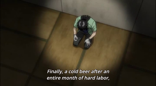 The strongest arc in the anime is the underground labor camp arc in the beginning of season 2. Months after a disastrous loss to the Teiai Group, Kaiji's in deeper debt than ever and no hope to ever pay it back. Since he can't pay in cash, Kaiji is abducted and put to work in the Teiai Group's underground forced labor camp. Prisoners there are tasked with constructing a massive nuclear bunker. A “kingdom” where even in a nuclear apocalypse the wealthy can live lives of luxury. After the 90% cut that goes towards debt repayment plus room & board, Kaiji is only able to pocket a mere ¥9,100 (about $85 USD) for an entire month of backbreaking physical labor.