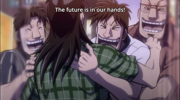 Kaiji isn't just the story of a man playing extreme gambling games. It's the story of a man who is part of a generation who got the economic rug pulled from under them. A narrow field of options and the crushing prison of debt weigh heavy on his spirit. But in the end he manages to pull through by uniting with those who share his plight. Kaiji's story is one that should resonate with American millennials and help them understand their common plight with the Lost Generation of Japan. Japan's Lost Generation is still reeling decades later, and things aren't looking so hot in America right now either. But Kaiji tells us that if we learn to stick together, we'll hit our jackpot eventually. Just like the show says, “The future is in our hands.”