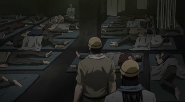 The work camp becomes even more insidious when a visit to the camp's infirmary reveals that paying off the debt through work may not be a possibility at all. When a worker collapses in a coughing fit, Kaiji is ordered to help take him to the infirmary. The whole way there, the worker is begging not to be taken to the camp hospital. He insists from his stretcher that he can still work. When Kaiji reaches the infirmary he finally understands the man's desperation. The sick room might as well be a graveyard. The narrator describes it best: “Laid out before him was a hell within hell! The end of the line! Lungs wrecked by dust, bodies destroyed by slave labor! Damned souls, suffering through their final hours!”