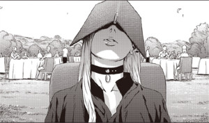 Not that the story does much with that idea after setting it up. Guideaux (pronounced “Guido”) is under a curse that may have separated them from their real body and very firmly believes that witches are the ultimate evil to the point where Ashaf can barely get anything done when they're around. Guideaux also has the social skills of a newt, which doesn't help to make the character any more likeable; presumably the fact that their real body looks like Berserker from Fate/stay night while their current form is of a teenage girl with teeth too big for her mouth is supposed to be funny, but mostly the character is just annoying.