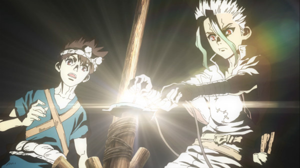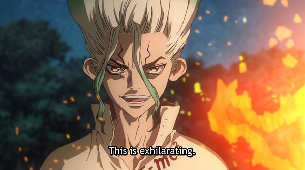 Based on the hit manga by writer Riichirou Inagaki and artist BOICHI, Dr. Stone is the story of what happens after a mysterious light engulfs Earth, turning every human on the planet to stone. 3700 years later, through chance or fate, the first human to emerge from this stone hibernation is Senku Ishigami, a teen prodigy who sets out to use his vast knowledge of science and engineering to not only reawaken the rest of humanity, but speedrun the entirety of human invention in the process. Faced with the seemingly impossible, Senku begins the methodical, painstaking path from Stone Age to Space Age, one invention at a time. One might think that would make for a tedious, laborious process to follow; one person trying to rebuild human society from the literal ground up shouldn't make for an engaging TV experience outside of a Discovery Channel reality show, but Dr. Stone has an almost scientifically perfected formula for turning the process of invention into something you can't put down. Whether crafting stone-age soap bars, building an iron forge, or the excruciating undertaking of making modern medicine from scratch, every new discovery comes with the thrill of learning something new and the satisfaction of a job well done for both the characters and audience. Edutainment is an objectively terrible word, but it's honestly the best way to describe the quirky mix of informative and fun energy Senku and his allies bring to every episode. But of course, even that wouldn't be enough to fuel an ongoing series on its own, which brings us to…