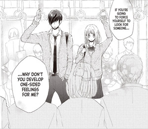 Anyway, Maaya considers this routine the basics of engaging in a one-sided love affair and for reasons that don't make any sense on the surface, she agrees to pretend to have one with the school's most popular guy because he's never experienced that before, as in he's never liked someone who didn't like him back. It'd make more sense if she agreed to “teach him” how instead of just...agreeing to stalk him. Yeah, I couldn't understand this narrative set-up at all. It's also extremely obvious that Chigira likes Maaya and invented this proposition because he wants her attention. Maaya continues to be in denial of this despite the fact that Chigira is incredibly overt. There are moments of physical closeness that are usually saved in manga for when a couple is outright dating and Maaya is still like, “no, he's out of my league” even though there's no explanation to his actions other than the obvious.