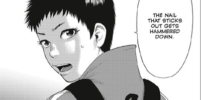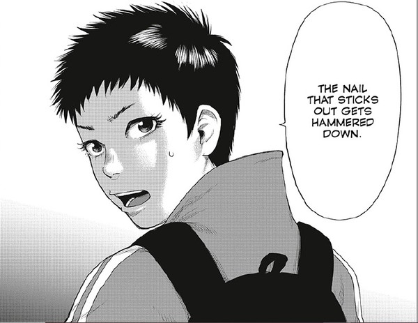 I can only speak about Boys Run the Riot from second-hand experience. Transgender isn't my particular branch of the LGBTQIA+ tree. But even if this book isn't about my lived experiences personally, it is still remarkable in how it captures what it means to not fit in, whether that's with your classmates, your family, your friends (or "friends"), or even with yourself. Nothing shows this like the image lead character Ryo paints on a wall at the end of the first chapter: a picture of a boy emerging from the unzipped back of a high school girl in uniform. The image has connotations of coming out, both in terms of queer identity and of emerging from a chrysalis, and it perfectly captures the struggle the characters are facing. Ryo may have created it as an expression of his trans identity, but it could easily be shorthand for the volume in its entirety.