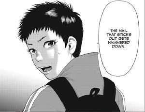 The first volume spends half of its pages getting readers into Ryo's head and understanding his insecurities. He doesn't feel that he's brave and is initially prone to behavior that might save his own skin at someone else's expense. Ryo loathes himself for it, even though it's necessary for his own social survival. It's when he begins collaborating with Jin on a streetwear brand that he starts thinking about how he really wants to express himself.