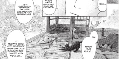Whether or not there's a spiritual component is also up in the air, and that allows for a bit of science fiction versus fantasy tension in the story, especially when the Fudo Shrine, which has been handling flow issues spiritually for eight hundred years, comes into the story. That's only in the final chapter of the book, but there are enough similarities between their approach and Hirota's that we really have to wonder where the line is drawn between method and belief, especially since the shrine also has a cat to help them out. All of it is lavishly illustrated with detailed artwork that spends most of its effort on the backgrounds rather than the characters, an interesting trait that we also saw in the creator's previous title to be released in English, Mushi-shi. All in all this is fascinating, and if it can be a little oblique or slow at times, it's worth reading nevertheless.