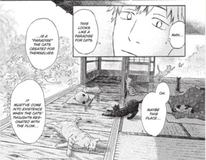 One of those is how cats fit into the whole thing. There's no shortage of myths about cats and their supernatural abilities – one I heard says that if a cat is staring at nothing and you look between their ears, you can see the ghost they're actually staring at – and those are backed up by real feline feats, such as how my mother's cat alerted us to her sleep apnea. Both combine in Shachō, the resident cat of the story. Shachō works with Hirota at his Flow Correction Agency, and his reaction to it not only helps Hirota and new hire Chima to figure out where a problem is, but also how large the problem might be. Between Shachō and Hirota they have a pretty impressive track record of resolving flow issues, and it's interesting to see how each case differs from the ones before or after it while still leaving us plenty of things to wonder about. Hirota's not right one hundred percent of the time, suggesting that not even he really understands what's going on; for instance, he has no firm answers for Chima when she walked through a patch of flow and emerged looking like she's twelve years old again.