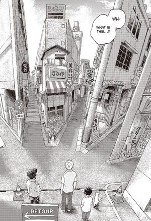 Sometimes you can tell what a creator's primary interests in a story are from how they present it, and other times they just straight-up tell you. According to Yuki Urushibara's notes after the first volume of When a Cat Faces West, her main motivation behind this series was in drawing 'modern day scenery'. She even mentions that it 'explains a few things', and does it ever. To be sure, that scenery is genuinely impressive throughout this book. It's all lovingly-detailed modern township locations, districts carried by their own personalities, then often twisted or spiced up when the supernatural 'Flow' phenomenon the story is built around comes into play. So you get a blooming cherry blossom tree or undeveloped stretch of forest teleporting in among the buildings, or in one extremely memorable instance, a district where the corners on every single object wind up rounded off. There's an explorative love of craft in showing all this off, and you could probably glean extra entertainment value just by going back through Urushibara's drawings multiple times for little details you'd missed.