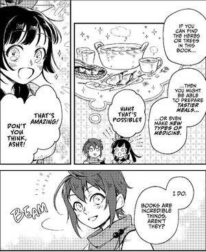 The story is otherwise relatively boilerplate isekai. Ash has memories of his past life that makes him smarter than the average eight-year-old, and with those memories comes a determination to elevate the lifestyle of Noscula Village into something more easily enjoyed. First on his list is learning to read and write; once he's got that out of the way he begins looking for books that will teach him things that will improve everyday life, like medicinal recipes and other similar things. We get a glimpse of how this makes him an outsider with the other kids his age, although that may be more due to the fact that Maika, the chief's cute daughter, has a crush on him. Ash is, as per usual, patently oblivious to the whole thing, though Father Folke does his best to be Maika's wingman. The most interesting aspect of the whole isekai thing is that Ash may not have been reborn from our world, but rather from the ancient version of his.
