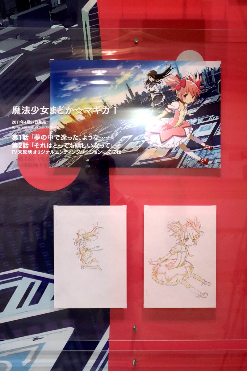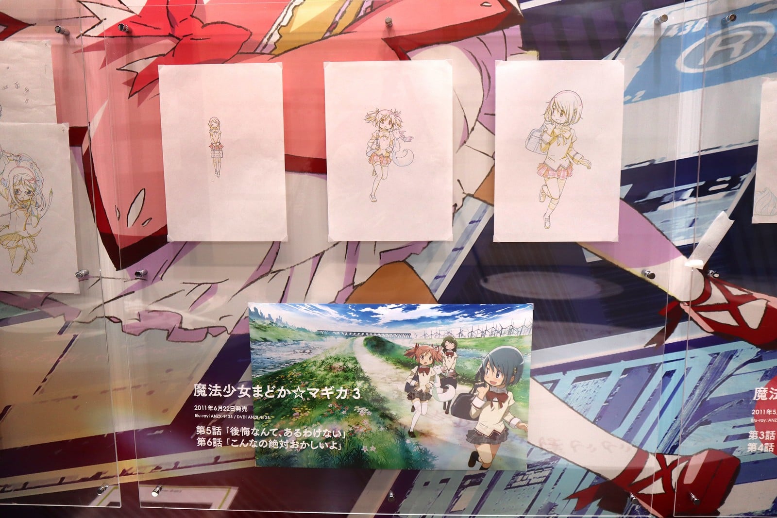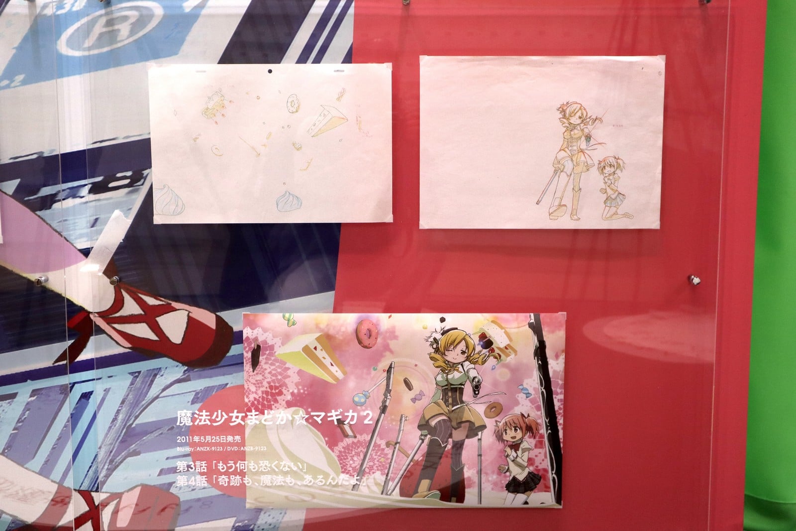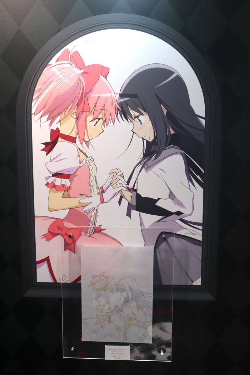 One of Shaft's first major original anime successes is 2011s Puella Magi Madoka Magica. And the SHAFT 50th Anniversary Exhibition does not disappoint with the presentation of the franchise. Dedicating an entire section to Puella Magi Madoka Magica, the section features a large display of Madoka Kaname and Homura Akemi and art pieces featuring Madoka, Homura, Sayaka Miki, and Mami Tomoe. Displayed throughout the section are key art from around the Puella Magi Madoka Magica franchise.