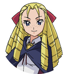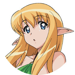 A half-elf who secretly lived in Westwood Village in the region of Saxe-Gotha. Because of this, she knows little about the world, and proves very naive. She has incredibly fair skin, wavy blonde hair, and pointed ears. Despite her slender proportions, her breasts are very big.