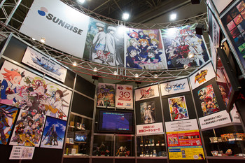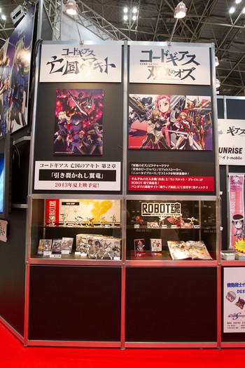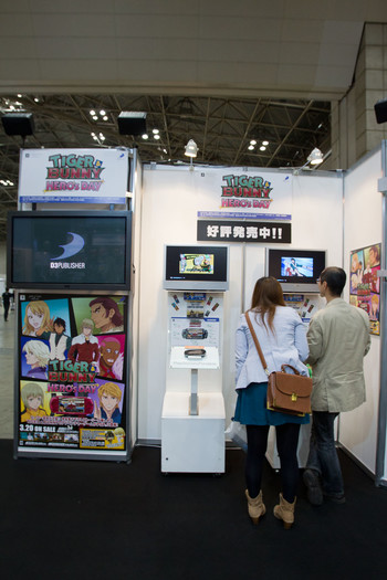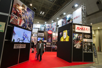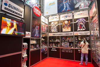 This year Bandai and Sunrise are very busy promoting Tiger & Bunny and Gintama's new movie, which will be in the theaters on July 6th. Among the stars of the show, Gundam Unicorn's 6th installment, currently enjoying an exhibition at the Gundam Front museum space until April 1st. A big video screen in front of the booth is showing trailers of their production, spanning from new to old, and inside the booth big posters advertise the latest works.