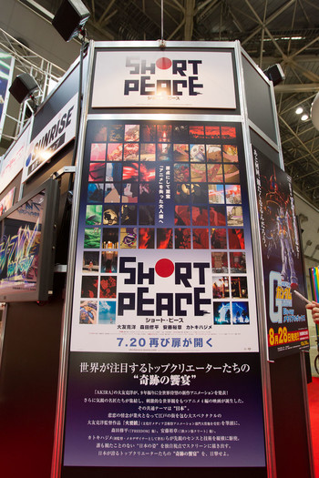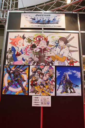Overman gets its little art show, exhibiting the original illustrations by Kenichi Yoshida, Akira Yasuda, Kinu Nishimura and Eiji Nakata drawn exclusively for the Blu-ray box. Adding to this year's TAF anniversaries galore, Sunrise's classic masterpieces celebrate their 30th birthday as well: Dunbine, Vifam, Votoms and Crusher Joe's corner brings back nice memories. Among the new stuff, Valvrave the Liberator and Karneval are highlighted with big plush dolls and oversized action figure, trailers and a gashapon machine. Phi Brain has a prime seat next to Gintama's movie while Battle Spirits and School Idol Project share a corner too. Finally, Katsuhiro Ōtomo, Shuhei Morita,  Hiroaki Ando and Hajime Katoki's near-secret short animation joint project Short Peace's poster announces it will be in theaters on July 20th.