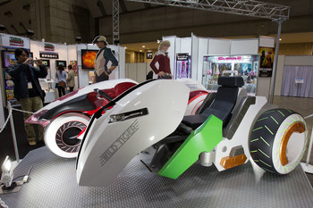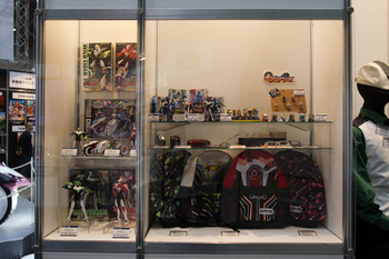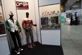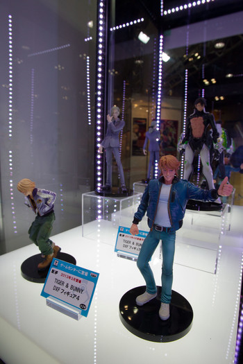 Just when you thought you had your Sunrise/Bandai fix for the whole year… think again! Tiger & Bunny have got their own booth, promoting "wildly" their new movie The Rising, slated for this Autumn! A real-life size replica of their bike and cut-outs of the heroes welcome you to the show. Inside you get to see everything a T&B fan would ever dream of: action figures, a videogame corner where you can have a go at Hero's Day–the new game that just went on sale on the 20th of March–glasses, watches, backpacks, even cosplay costumes courtesy of Bandai Fashion Net. Sunrise seems very keen to promote the series abroad as well.