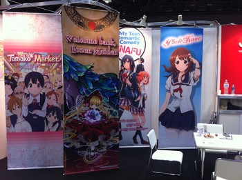 TBS is the MVMP (most valuable moe provider) of the show with their usual impressive lineup: ToLOVEru Darkness, Chunibyō demo Koi ga Shitai, Photo Kano, My Teen Romantic Comedy SNAFU, Rozen Maiden and Tamako Market are well represented by trailers, tapestries, a B4 poster set and graphig.