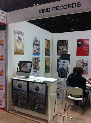 King records has got a small booth but great works on show, upcoming Flowers of Evil (Aku no Hana) TV series based on Shūzō Oshimi's fantastic manga, then 2012 titles K, Say "I love you" (Suki-tte Iina Yo), Kokoro-Connect, Joshiraku, Mysterious Girlfriend X, providing a show reel and English leaflets about their whole anime and musicians catalogs.