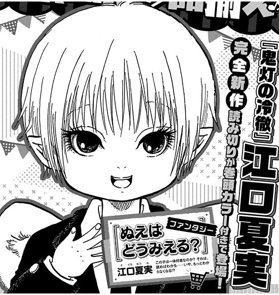 Le numéro de septembre du Morning, édité par Kodansha, a révélé mercredi que Natsumi Eguchi allait sortir, dans la prochaine édition du magazine le 25 août, un nouveau one-shot de fantasy intitulé Nue wa Dô Mieru?.
