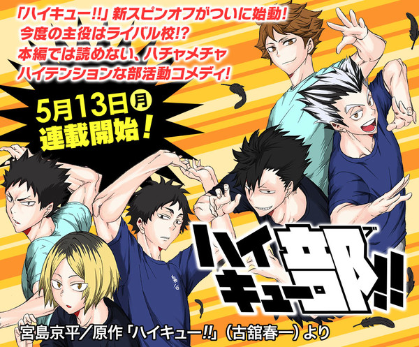 Le site et l'application de Shueisha Shonen Jump + ont ajouté à leur liste d'arrivées un spin-off pour le manga de Haruichi Furudate Haikyu!!. Cette nouvelle histoire, dessinée par Kyôhei Miyajima, arrivera le 13 mai sous le titre Haikyūbu!! et mettra en scène des rivalités entre écoles.