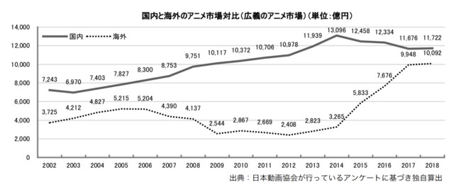 Le marché japonais et le marché d'outre-mer ont connu une légère croissance en 2018. Le marché de l'animation japonais a connu une croissance pour la première fois depuis 2014. Parallèlement, le même marché, à l'étranger, a dépassé la barre du billion de yens pour la première fois, bien que la croissance sur le marché d'outre-mer ait ralenti après une hausse plus soutenue au cours des dernières années. Pour illustrer nos propos, voici le graphique, avec le marché intérieur représenté par la ligne continue et le marché étranger par la ligne pointillée :