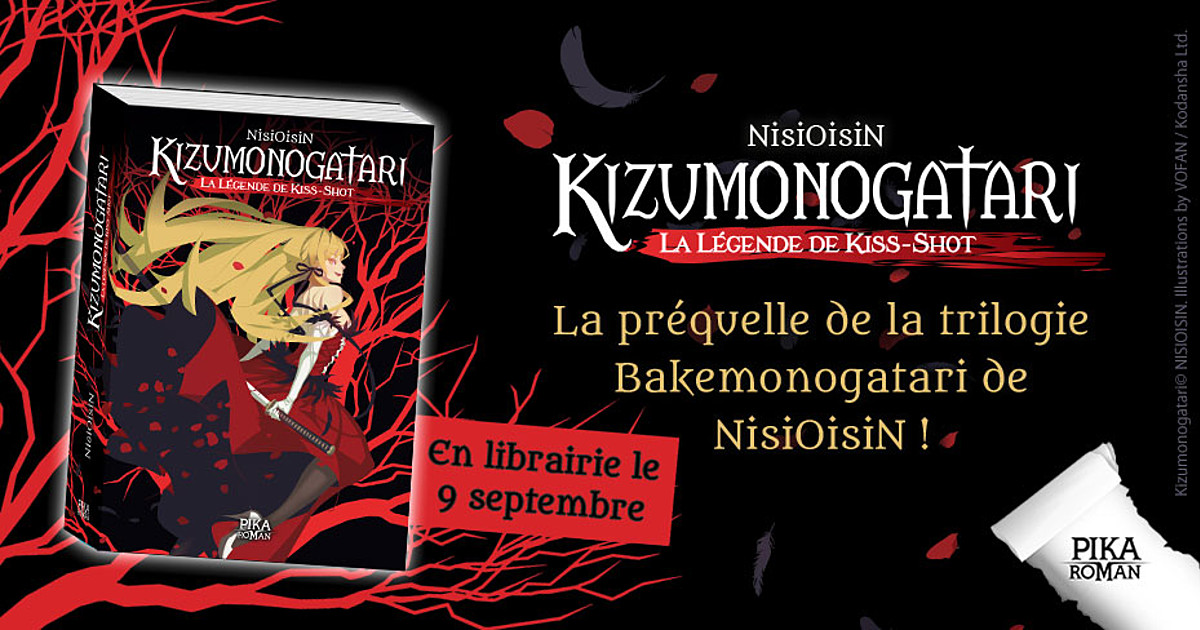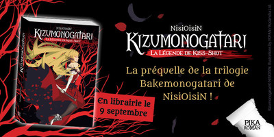 La collection Pika Roman va accueillir le titre de NisiOisin Kizumongatari - La Légende de Kiss-Shot (16.95 euros, 464 pages), le 9 septembre prochain.Pika indique au passage que le 3e et dernier tome du roman Bakemonogatari est prévu au 10 juin prochain.