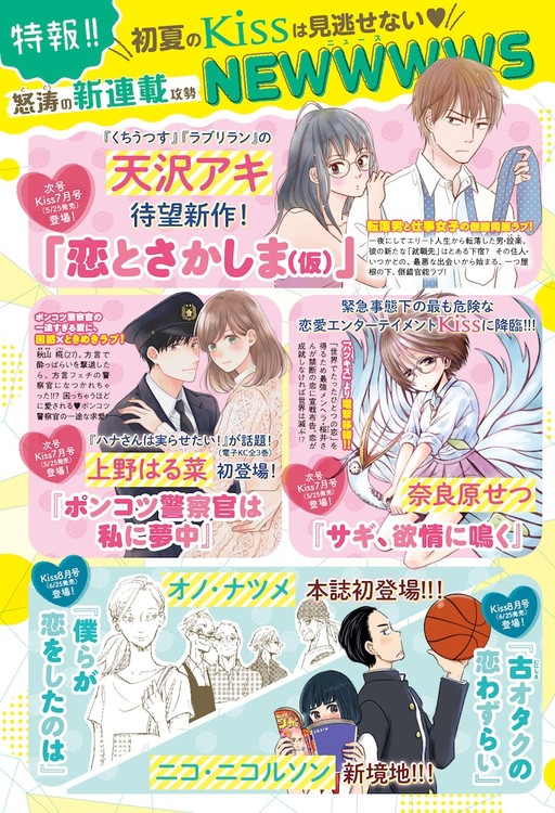Haruno Ueno sortira également un nouveau titre dans le magazine, le 25 mai, de même que Nico Nicolson le 25 juin. Notons que le manga Sagi, Yokujô ni Naku de Setsu Narahara sera transféré le mois prochain du Hatsu Kiss au Kiss.