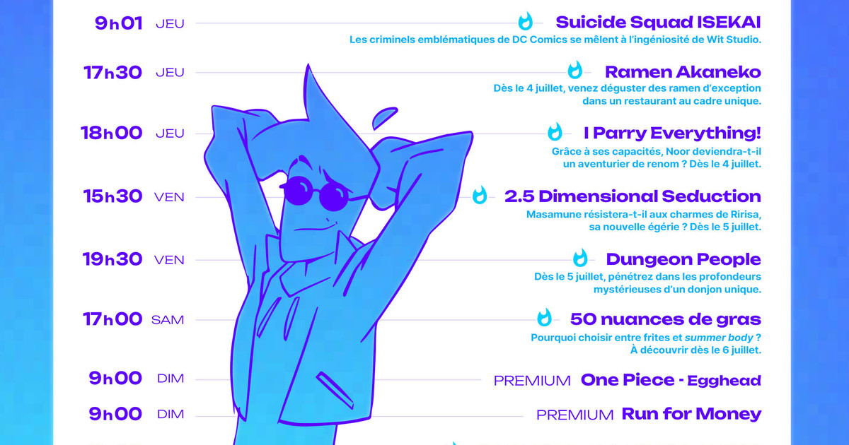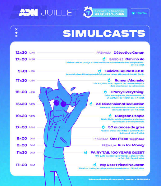 Du côté du simulcast, on retrouvera les anime Oshi no Ko Saison 2, Suicide Squad ISEKAI, Ramen Akaneko, I Parry Everything!, Dungeon People, 50 Nuances de gras, My Deer Friend Nokotan ainsi que FAIRY TAIL 100 YEARS QUEST.