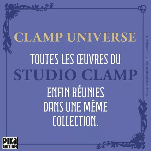 Les éditions Pika annoncent la publication française de la collection Clamp Universe qui réunit les séries majeures du célèbre studio composé de quatre mangaka. Elle est basée sur la collection japonaise intitulée Premium Collection.