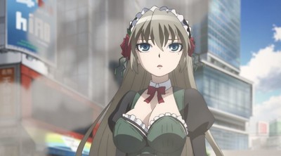 The interactions that Asuka has with the two girls trying to befriend her are promising, but the real draw is of course the graphic violence of the series. Limbs get destroyed or severed, Asuka imagines a child getting bloodily crushed, and later she literally dices up an opponent threatening her friend with an automatic rifle. All of this is executed pretty well (even if the animation struggles to keep up at times) and set to a musical score that mixes dramatic orchestration and driving hard rock. On that note, the opening theme is also a highlight.