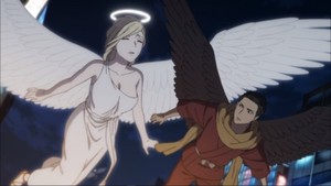 En fait, on découvre rapidement qu'on est dans un remake version anges et démons de Roméo et Juliette ! Entre ces deux peuples, la guerre couve. Et Arata découvre alors la réelle cause des tapages nocturnes qui empoisonnent les nuits du quartier. Mais surtout il se rend compte qu'il les comprend et il est le seul. Grâce à ce don, il évite une belle baston où les humains auraient sûrement encore brillé par leur manque de finesse. Une fois dévoilée la tentative de fuite en amoureux de l'ange et du Tengu, chaque famille rentre dans ses pénates et Arata s'effondre épuisé par l'utilisation de l'oreille ultime, dite l'oreille de sable… C'est tout de même étonnant que le petit gars ne se soit jamais rendu compte qu'il entendait des trucs bizarres, mais prenons cela comme un postulat de base, sinon on ne tient pas l'épisode. Mais attention, Arata Miyako n'est autre qu'un descendant de Abe no Seime, un onmyodo, un chamane du Xe siècle, tellement populaire au Japon, qu'il fait partie du folklore nippon et apparaît dans de nombreux mangas.
