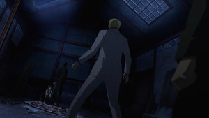 En effet, ceux qui lisent la série savent que The Eminence in Shadow est une pure comédie jouant sur le ridicule et l'exagération par le biais d'un personnage aussi fort qu'il est risible. Et pourtant ce premier épisode fait le choix d'adapter un chapitre bonus complètement sérieux où notre héros est un lycéen taciturne. Du point de vue de sa camarade de classe, il est asocial et il n'est pas agréable, il n'arrive même pas à se souvenir de son nom alors qu'elle vient d'une famille particulièrement connue. Ça l'agace un peu mais tant pis elle sait se contenir. Mais un soir, alors qu'elle rentre chez elle sans son chauffeur, qui a visiblement eu un empêchement, elle se retrouve enlevée sous les yeux de ce camarade si insupportable à ses yeux. Il ne vient même pas la secourir ! Alors qu'elle est ligotée et menacée par deux hommes dans un entrepôt désaffecté, tombe depuis les verrières un homme encapuchonné armée de pieds de biche et bien décidé à en découdre.