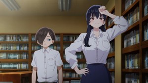On assiste à un enchaînement de scènes qui mettent très mal à l'aise alors qu'elles sont censées être touchantes ou adorables, voire même au minimum drôles. Et c'est bien là le problème de The Dangers in My Heart. L'anime montre un personnage creepy agir n'importe comment pour protéger la fille qu'il aimerait tuer. Un coup il déchire son exposé en pleine classe avant de détourner l'attention d'Anna, un autre il balance son vélo à la flotte pour l'éloigner d'un garçon qui la drague... Et on passe l'insoutenable scène où ils imitent à deux des chats pour faire croire qu'il n'y a personne dans la bibliothèque tellement c'est gênant. C'est dur, surtout que l'anime est exagérément vulgaire, sûrement pour faire jeune, et absolument jamais crédible avec ses personnages qui sont des clichés sur pattes.