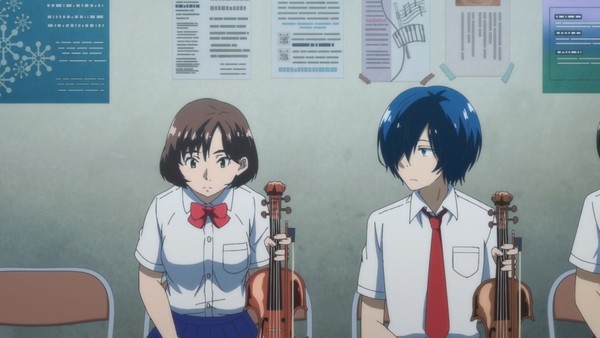 En se concentrant sur Hajime, Blue Orchestra concentre toute l'attention et potentiellement toute l'émotion de son spectateur sur le protagoniste. Le véritable enjeu n'était pas sa présence, mais plutôt de savoir qui de lui ou Nao aurait la meilleure place. Même Ritsuko N.'aura pas voix au chapitre, ses efforts se révélant logiquement vains pour obtenir une place dans l'orchestre. Il faut dire que dans le cas contraire, l'exigence du haut niveau évoquée régulièrement dans la série aurait volé en éclats. Une large partie de l'épisode s'intéresse donc à la « nostalgie » que ressent Hajime pendant son audition. Y est d'abord évoquée la ressemblance physique entre son professeur et son père, que l'on s'imagine être mise en place pour un futur « duel » psychologique entre les deux personnages. Et il y a cette perte d'identité, toujours véhiculée par les dialogues, que Blue Orchestra met en lumière ici au sujet de Hajime. Lequel n'aurait manifestement plus cette personnalité artistique qui le caractérisait dans son passé.