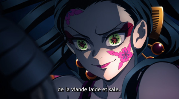 Juste après son forfait, maître Muzan lui a rendu visite. Il félicite la 6e Lune, mais la met en garde contre les piliers et les pourfendeurs. Daki est non seulement très belle, mais elle a déjà tué sept piliers. Ce n'est pas en s'en prenant à Zenit'su qu'elle va comprendre. Elle ne sait même pas que c'est un pourfendeur. C'est juste une oiran d'une cruauté infinie, qui n'a pas assez de finesse mais elle comprend pourtant que cette « fille » n'est pas ordinaire. Si la jeune fille a reçu un coup de poing, elle feint l'évanouissement. Elle se réjouit car son piège fonctionne. Son but est simple : les dévorer. L'oiran n'en est pas à son coup d'essai comme le montrent les images en noir et blanc. Elle fait régner la terreur depuis des décennies. Nos amis vont devoir faire bien attention. Décidément, Demon Slayer reste une série de qualité, au graphisme toujours aussi magnifique.