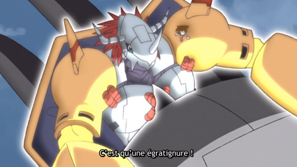 La seule issue est que Taïchi et War Greymon fassent diversion et tentent seuls d'abattre le monstre d'acier, le temps que les autres reprennent des forces. Pour cela ils doivent se mettre à l'abri. Un rude combat s'annonce d'autant que Mugendramon n'est pas prêt à se laisser vaincre. Taïchi et War Greymon s'en sortiront-ils intacts ? Il va falloir patienter car comme les autres enfants, nous les voyons partir dans une explosion géante…