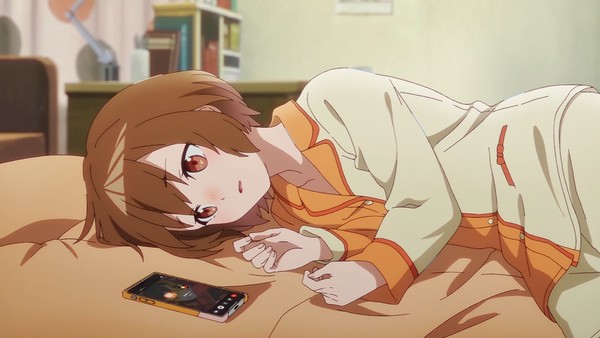 De mémoire récente, Wonder Egg Priority était la dernière à avoir magnifié ce point précis. Jellyfish Can't Swim in the Night a des forces évidentes, mais celle d'intégrer de manière si homogène, si harmonieuse les personnages avec leurs environnements est de toute évidence l'un de ses plus grands talents. C'est peut-être le signe le plus manifeste de la maîtrise technique de la série, toujours impeccable et qui se double en plus ici d'un joli écho thématique. On parle bien sûr du personnage de Kiwi, ostracisé du fait de son enthousiasme jugé excessif et de sa passion pour la pop culture. Représentée à l'écran comme l'archétype du hikikomori largement véhiculé par l'industrie depuis des lustres, rejetée par le monde qui l'entoure, la jeune fille suscite pourtant une émotion par la capacité de la mise en scène à traduire par l'image l'intensité de sa solitude existentielle. Toujours en suggérant visuellement son appartenance au monde et ce, en dépit d'une évolution simple, voire simpliste du personnage.