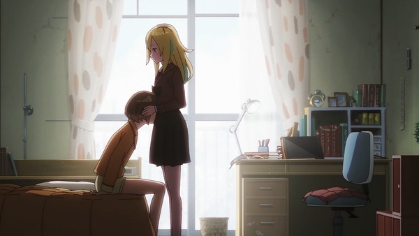 Et revoilà (déjà) du grand Jellyfish Can't Swim in the Night ! Le genre d'anime qui, par une mélodie entêtante, son usage des couleurs, du flou ou sa maîtrise du découpage, parvient à nous faire éprouver la bascule d'un personnage ignorant les compliments pour mieux s'attarder sur les rares commentaires négatifs de son travail. Un mal bien connu de tout créateur, et ici doublé de l'inévitable comparaison avec meilleur que soi. La force de l'épisode n'est pas tant son écriture, avec son syndrome résolu en quelques efforts de dessin et le pouvoir de l'amitié (ou de l'amour, comme semble l'indiquer un baiser surprise au final), mais bien la puissance d'évocation de sa réalisation. Une réalisation à la fois si simple en apparence et si complexe, tant elle repose uniquement sur la grammaire de ses images.