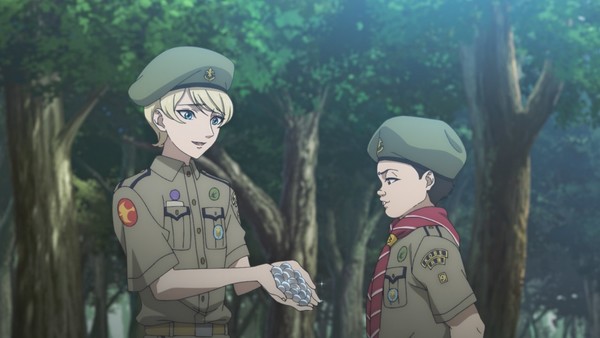 Les deux frangins vont donc tout faire pour aller se balader dans les différentes maisons du village ! Direction les scouts, a priori la meilleure solution pour se faire des amis et ainsi les rejoindre chez eux. La quête d'apprentissage de Migi et Dali se double donc d'une découverte des émotions humaines, dans un large spectre : se contenir face à des injustices (le gamin tyran avec ses dents de rongeur), découvrir les « douceurs du monde sauvage » (un plan aux frontières de l'érotisme où l'un des jumeaux est enlacé par une jolie demoiselle en plein sommeil) ou encore feindre l'empathie dans des scènes tantôt très drôles (le fou-rire à contretemps), tantôt étranges (le jeune déguisé). C'est ce qui retient principalement l'attention dans cet épisode peut-être moins absurde qu'à l'accoutumée.