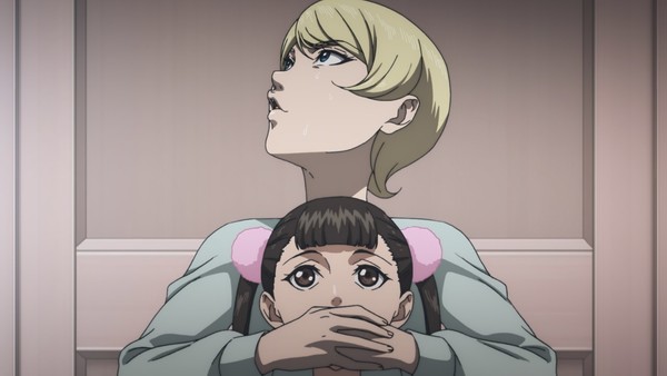 Forcément, difficile de ne pas citer ces quelques minutes ou la matriarche Ichijô tente d'assommer Migi avec… une baguette tradition (« très très dure », nous dit-on, même si cela n'empêche pas une bonne bouchée pour entretenir le suspense de manière totalement artificielle). Le combat entre celle-ci et la femme de ménage mérite aussi le coup d'œil, même si l'humour reste ici plutôt inhérent à cette dernière, comme en témoigne son entrée en scène avec punchlines à la clé. Autant dire qu'une nouvelle fois, on ne peut s'empêcher de trouver l'exécution ratée, tout en visualisant parfaitement la volonté de cette adaptation de trouver un équilibre extrêmement complexe à tenir sur la durée. C'est ce qui fait que l'on continue de suivre l'anime avec intérêt : non seulement les révélations pleuvent enfin, mais en plus le rythme s'accélère-t-il pour mieux nous faire accepter des situations dignes d'une très mauvaise série B.