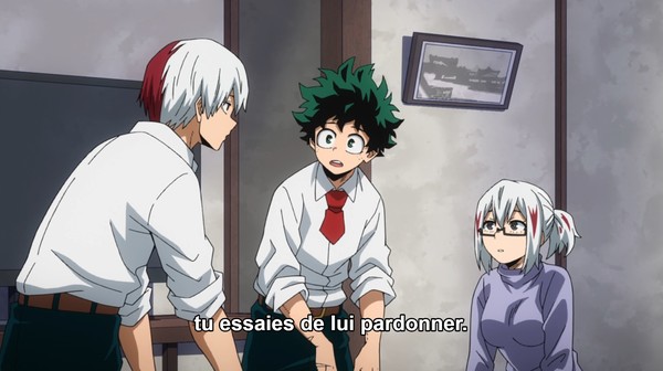 Le point de vue revient sur le trio principal qui est en formation chez le numéro un, mais plus que l'entraînement, c'est la famille d'Endeavor et de Shoto qui est mise en avant dans cet épisode, avec un ton plus intimiste. Et étonnamment pour un shônen, c'est sur cette dernière composante que le récit est le plus sombre.