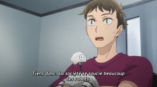 La première leçon vise à ce que les capteurs de Mamoru fassent la distinction entre le froid, le chaud et soit capable de prendre la température de Takuma en lui tenant la main. Petit à petit, avec l'enseignement rigoureux et parfois même un peu rude de Mina, il apprend très vite. Mais a-t-il encore en mémoire la règle ultime ? Pour éprouver son « enfant », Mina va mettre son maître en danger, et le petit réagit parfaitement, déclenchant le bon protocole. Takuma est rassuré sur les aptitudes de ses robots. Quand il se rend compte que Mina pourrait, outre la cuisine, faire aussi le ménage, même si cela implique des publicités toutes les minutes (transmises via Mina), le voici parti avec Mamoru, laissant le gros du travail à sa robote. Quand il envisage de l'emmener au cinéma, il doit passer par la case évaluation de Mamoru afin de connaître le prix pour la place de cinéma du petit robot. C'est un petit surdoué qui apprend très rapidement.