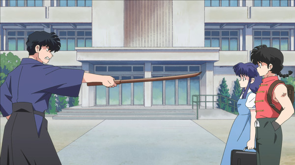Quand ils arrivent aux abords du lycée Furinkan, on comprend très vite pourquoi Nabiki n'a pas voulu arriver avec eux. Devant l'établissement, tous les prétendants d'Akane la défient et c'est baston générale ! C'est tous les matins pareil. Ils sont en effet convaincus que seul celui qui la battra aura l'honneur de sortir avec elle, comme l'explique le ténébreux Tatewaki, le capitaine de l'équipe de Kendo, lui aussi amoureux d'Akane. Le combat qui suit pourrait se dérouler sans accroc si le ciel ne se couvrait et qu'un orage ne se déclenchait. Et voici notre ami transformé en demoiselle et son adversaire totalement déconcerté quand un panda géant lui fonce dessus, enlevant Ranma.