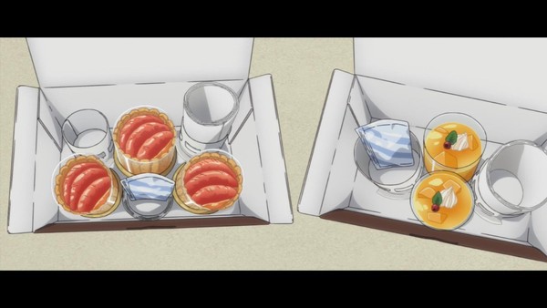 Il est une nouvelle fois question de sucreries ici, avec cette fois-ci des flans aux mangues et des charlottes particulièrement appétissantes. Kobato. est chargée par Osanai d'aller s'en procurer dans une pâtisserie du coin, histoire de débuter son parcours estival visant, justement, à dresser un top des meilleures dégustations de la région en la matière. Captivé par le goût d'une charlotte qu'il entame alors que sa comparse s'absente pour téléphoner, il la termine et fait mine qu'il n'en avait acheté que deux, plutôt que trois, histoire de renouveler l'expérience sans qu'Osanai n'y voie rien à redire. Oui oui, c'est bien le pitch de ce sixième épisode, ni plus ni moins surprenant que les précédents, mais toujours avec cette efficacité renouvelée dans la mise en scène du minimalisme à l'écran. Dans le genre série qui n'a absolument rien à dire mais le fait remarquablement bien, on tient là un nouveau modèle du genre.