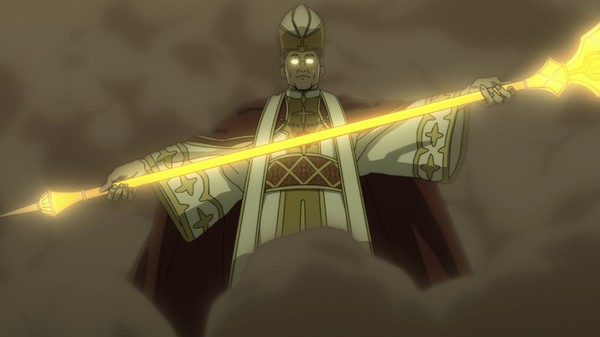 Le méchant pape de l'Eglise (qui est toujours le mal hein, c'est une vérité vérifiable maintenant [c'est bizarre cette dent contre les monothéistes alors que les catholiques se sont fait persécuter pendant des siècles au Japon mais passons]) a acculé Motoyasu et Naofumi dans un cratère avec leurs équipes respectives. L'Eglise des trois héros était derrière toutes les manigances qui ont mené notre héros à être ostracisé par la population. Avec une armée de mages prieurs pour l'alimenter en mana, le vilain pape veut faire porter le chapeau à Naofumi le démon au bouclier pour la mort des trois autres héros. Sauf qu'il vend la peau de l'ours avant de l'avoir tué, car Motoyasu est sacrément sur les nerfs de s'être fait manipulé. Touché dans son égo, il lance (lol) une salve d'attaque dévastatrice ! Mais c'est sans effet. l'Eglise des trois héros a avec elle L'Arme Ultime, une création hérétique fusionnant en un seul artefact les 4 armes héroïques.