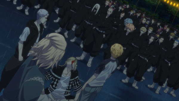 C'est finalement une baston générale qui débute entre les deux clans, l'arrivée des troupes du Tôman au grand complet faisant d'ailleurs son petit effet ! Chaque membre émérite a ainsi l'occasion de briller dans cette bataille rangée… C'était là l'occasion pour les animateurs de mettre le paquet, hélas, les passes d'armes sont bien sages, tout à fait quelconques, sans une emphase sakuga que l'on aurait aimé au cœur de l'action. Pendant ce temps, Takemichi, lui, continue de ramper au sol, perdu dans le tumulte ambiant. Lui seul sait pourtant que le drame peut encore se produire… Parviendra-t-il seulement à l'empêcher ? En définitive, un épisode prometteur mais dont le souffle retombe assez vite.