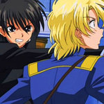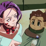 | 6. Photon/Keyne (Photon: The Idiot Adventures) Young-looking and -acting (but overall awesome dude) Photon sets out from his village to save Aun, the village chief's daughter and his childhood friend who sneaked off to try and see a pop star, and the two wind up on a space adventure instead...but not before an angry Aun writes the word "baka" (idiot) on Photon's head while he sleeps. When he wakes and notices, Photon is irritated himself and writes the word on the next forehead he sees: that of sleeping space rebel Keyne. In Keyne's culture, sharing a forehead mark is a sign of marriage, and apparently it's also the entire process of getting married, so she spends the rest of the too-short OAV comedy considering them to be husband and wife. |